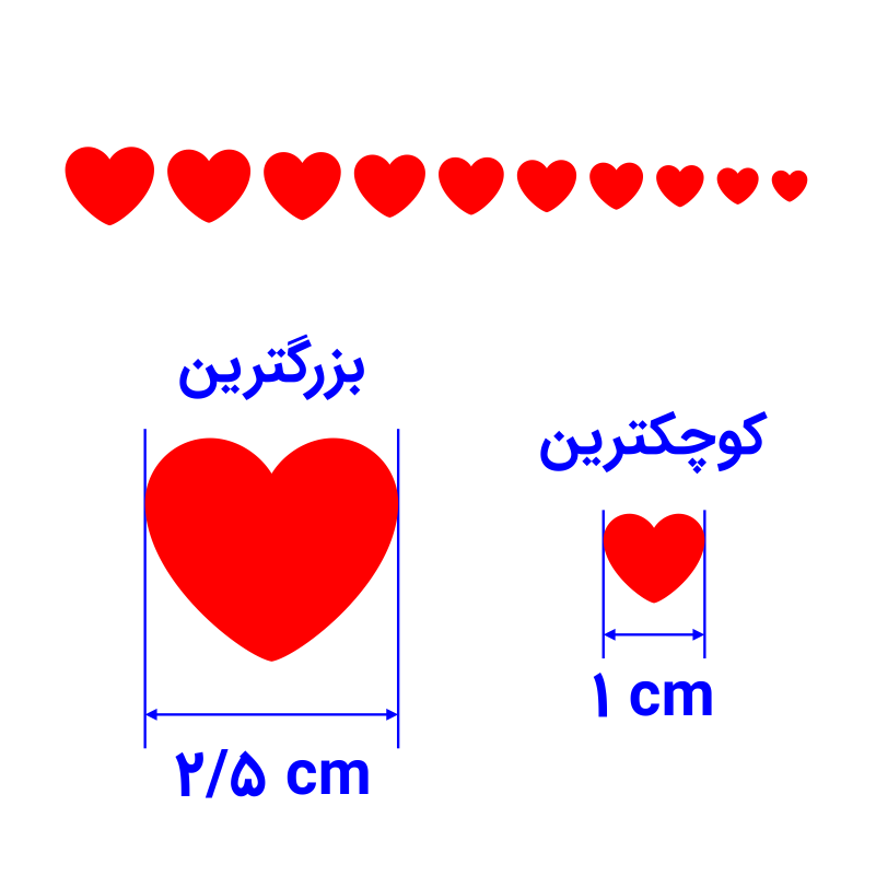 50 قطعه برچسب (استیکر) برش خورده به شکل قلب در اندازه های بین 1 سانتی متر الی 2/5 سانتی متر و به تعداد مساوی از هر سایز. توجه فرمایید رنگ استیکرها مخلوط نیست ، با انتخاب هر رنگ تمام 50 قطعه از همان رنگ ثبت می گردد .